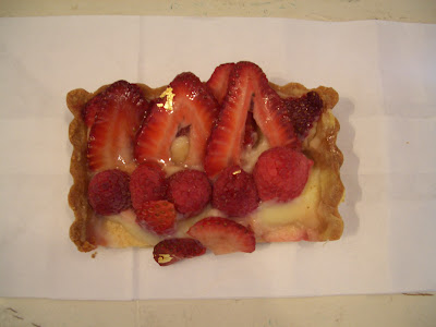 A lovely girl came in the shop the other day, looking for help getting measurements for a bridesmaids dress. The dress was being made back in Michigan, where the wedding was being held, but the shop needed her measurements now to get the dress started. I said if she found out from the shop what measurements they needed I could probably help her out, which she was excited about since the tailor's had quoted her $50 to get measurements done. Asked what I'd charge, I said a cup of coffee sounded good, because it really doesn't take that long to measure someone, and I like bartering anyway. She came back a week or so later, just needing bust-waist-hips measurements, which took about a minute and a half to do. Having just had a cup of tea, I said I could go for a pastry, and she brought me that gorgeous looking strawberry tart as payment. Those are little gold-leaf bits for embellishment, and it tasted like honeyed sunshine. I can't imagine a happier exchange.